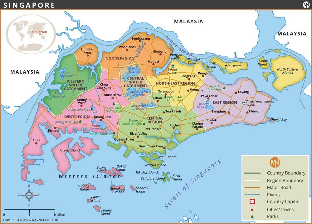 This map of Singapore highlights its five major regions—Central, East, North, North-East, and West—along with parks, islands, roads, and water catchments. It also shows key towns, Changi Airport, and surrounding islands. Ideal for educational, travel, and reference purposes, it provides a comprehensive view of the city-state's geography.