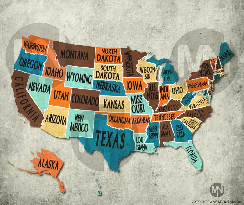 Wall map of the United States, showcasing the country’s 50 states in a visually appealing, color-coded design. The map outlines the geographical boundaries of each state, clearly labeling them with bold, large fonts that make the state names stand out against the varying background colors. Each state is uniquely colored, with no two adjacent states sharing the same hue, helping to visually distinguish the borders. The color scheme consists of a mix of earthy tones—ranging from browns, oranges, and blues to greens and yellows—that give the map a vintage, rustic feel.