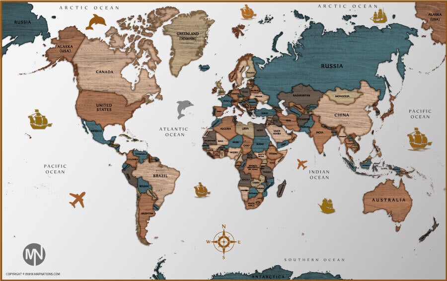 A compass rose at the center-bottom enhances the navigational theme, while the wooden texture gives the map an artisan feel, making it a beautiful decor piece for both modern and rustic interiors. The overall aesthetic evokes a sense of adventure and exploration, appealing to travel enthusiasts and geography lovers alike. The subtle combination of minimalist icons and carefully chosen color schemes adds a timeless elegance to this world map. It serves not only as an educational tool but also as an artistic statement in any room.