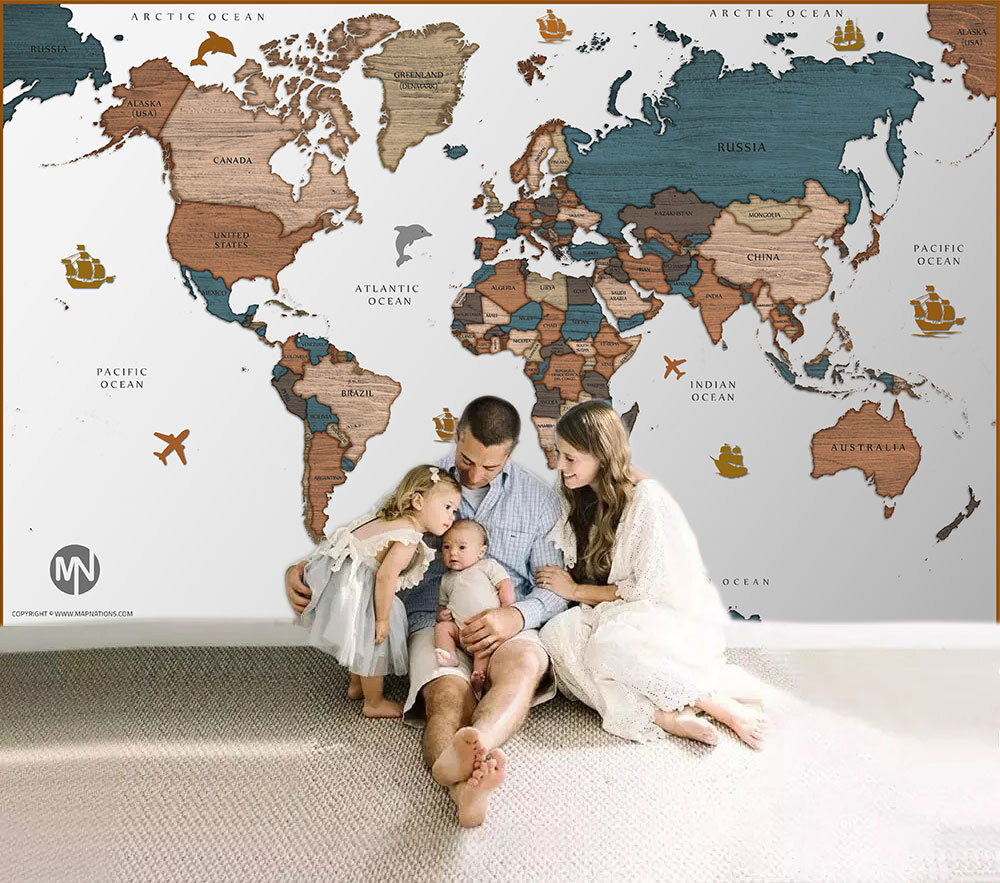 This world wall map offers a unique visual appeal with its wood-textured design, showcasing countries and continents in an earthy, rustic style. The map features distinct colors for different regions: North America, South America, Europe, Africa, Asia, and Australia are highlighted with a blend of deep wood tones and muted shades of blue, brown, and green. Major countries such as the United States, Canada, Russia, China, and Australia are prominently labeled. The oceans, including the Atlantic, Pacific, and Indian, are clearly marked, surrounded by charming decorative elements like vintage-style ships, airplanes, and dolphins.